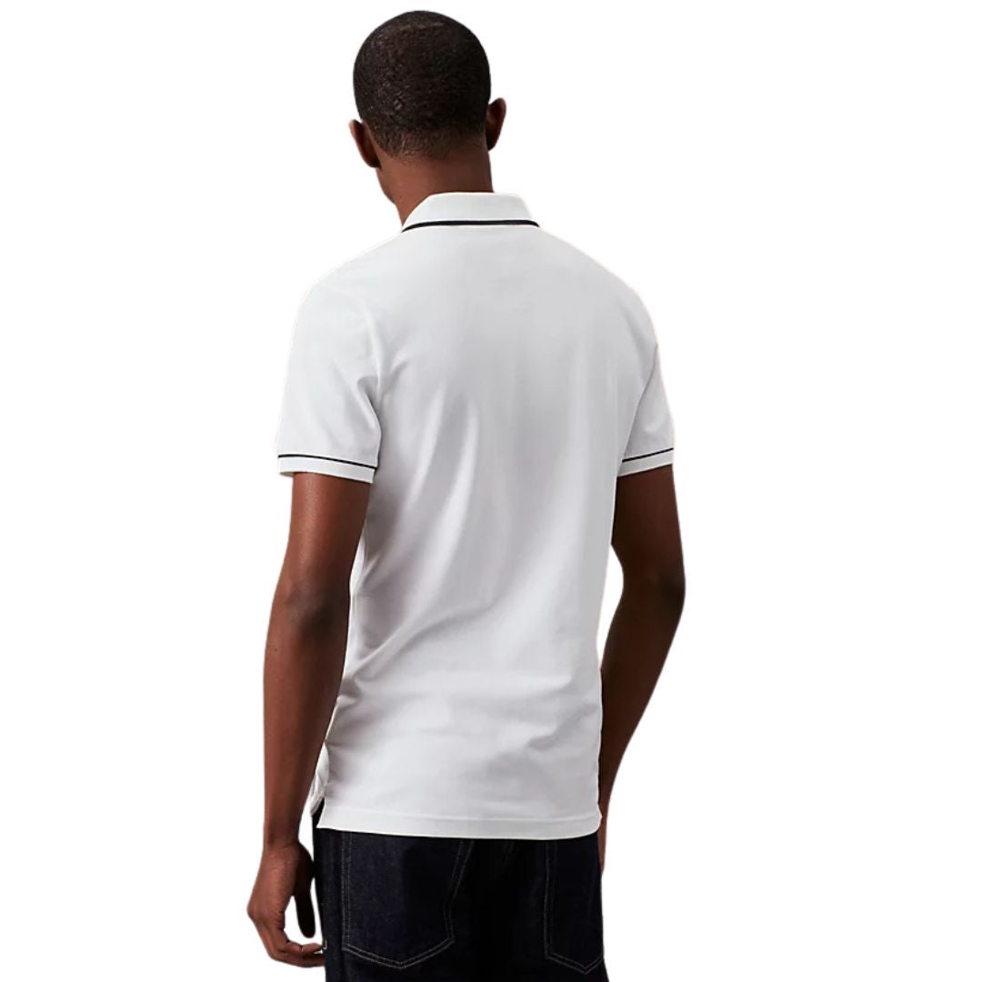 Calvin Klein férfi póló, fehér, slim fit fazon, kétgombos gallérral, rövid ujjal, kontrasztos szegéllyel a galléron és a mandzsettákon, Calvin Klein hímzéssel a mellkason.