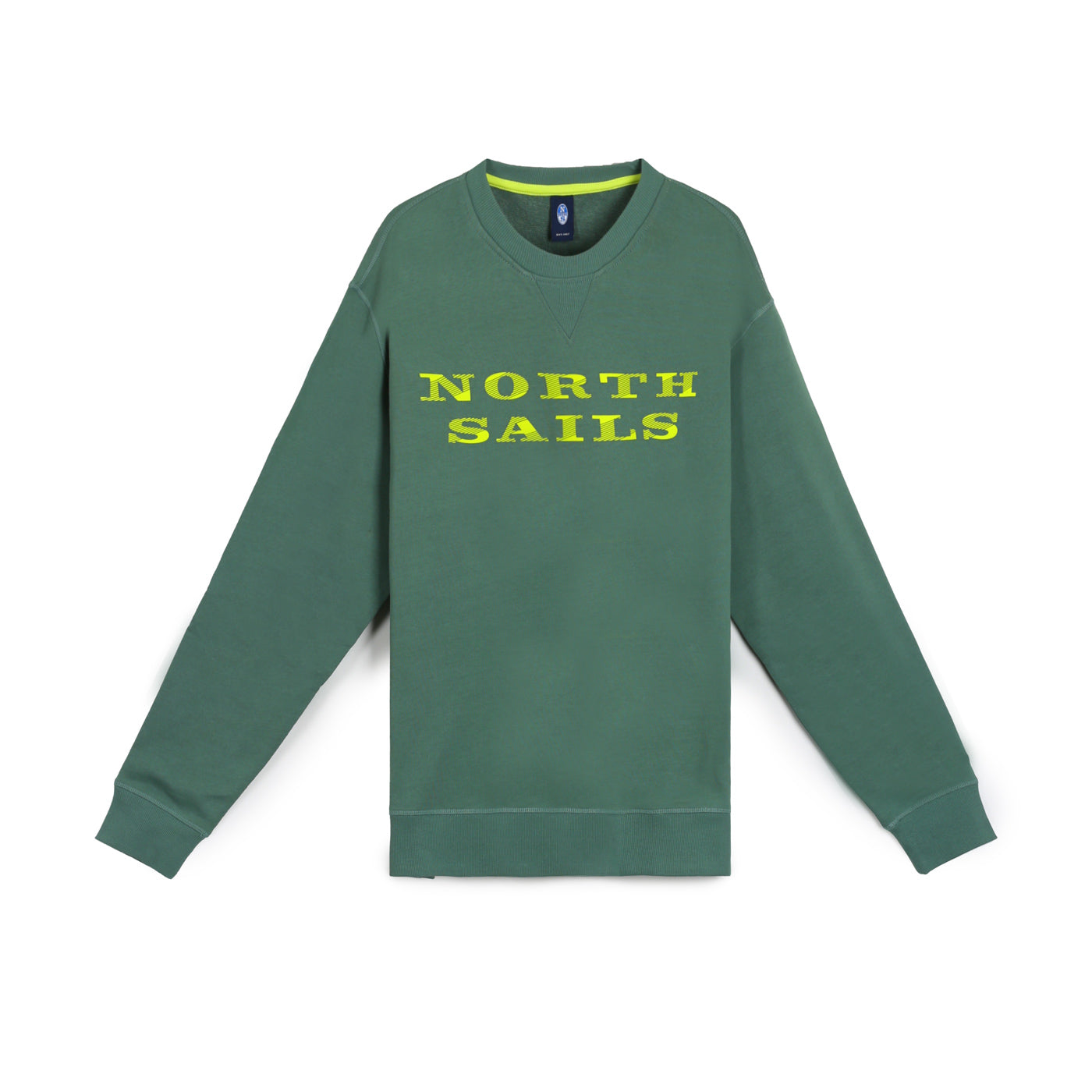 North Sails férfi pulóver, zöld, hosszú ujjú, kerek nyakkivágással, mellkasi grafikával.
