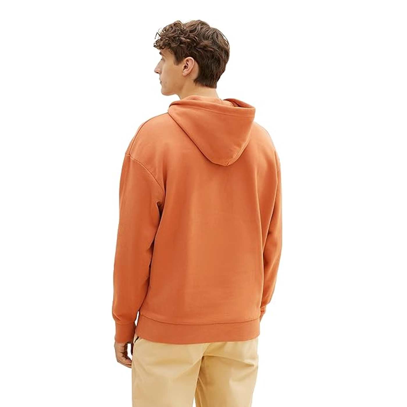Tom Tailor férfi kapucnis pulóver, gallér nélküli, hosszú ujjú, kapucnis, narancssárga színben.