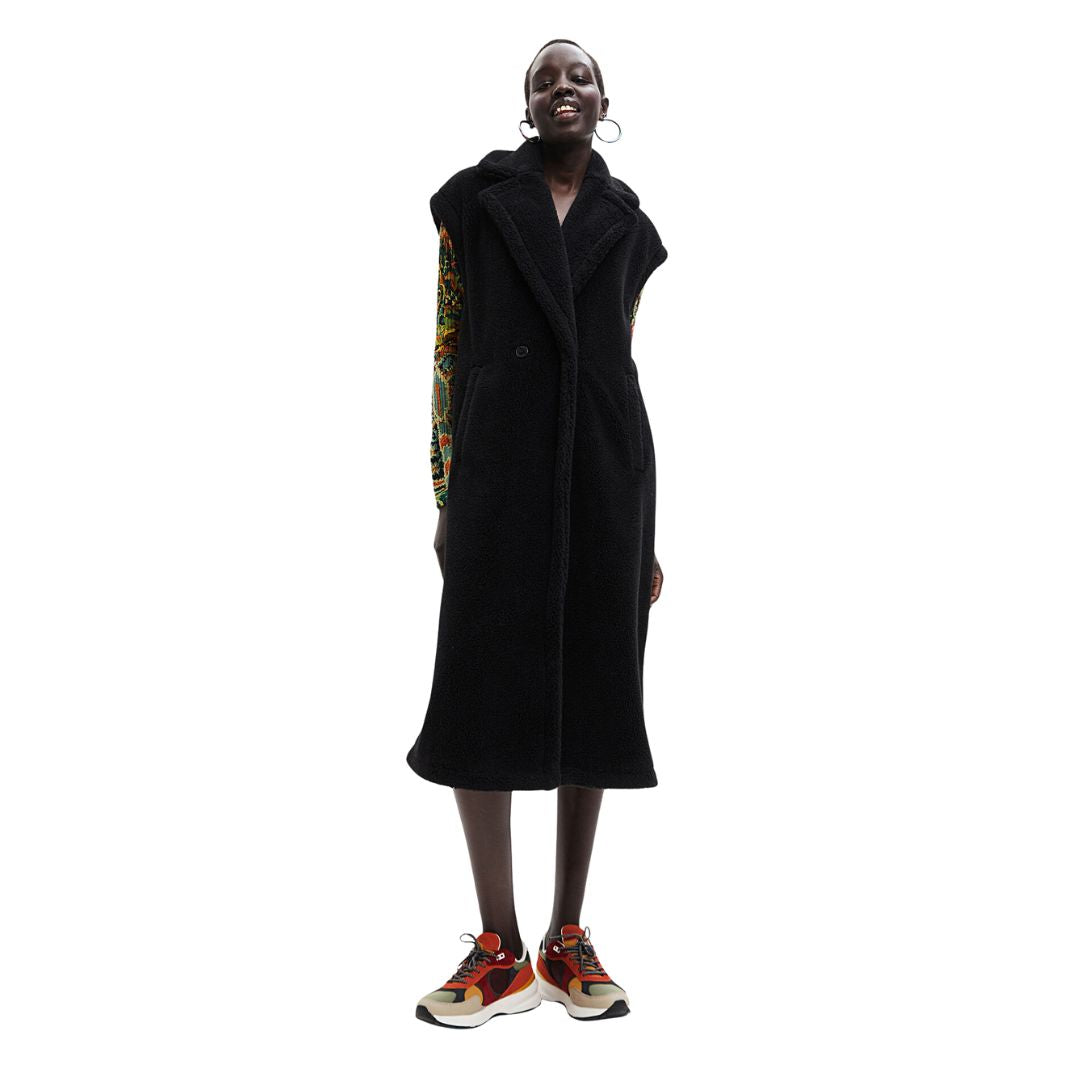 Desigual női abrig cameron mellény, fekete, ujjatlan szőrmés kabát gallérral és hajtókával. Két elülső zsebbel és fém gombos záródással.