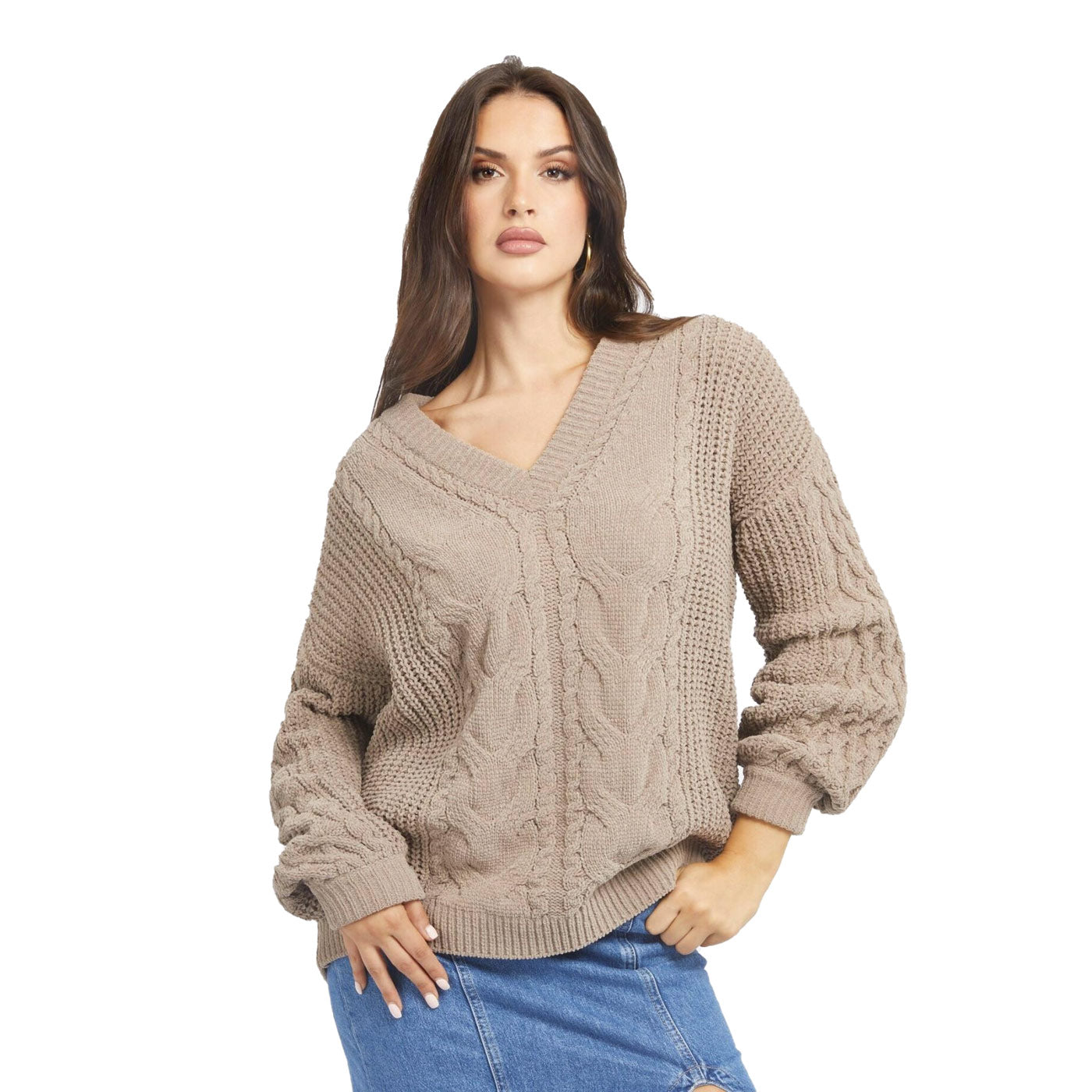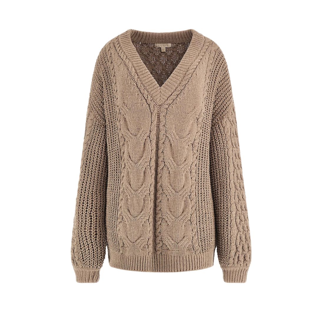 Guess női pulóver, testhezálló, V-nyakú, vastag kötésű,. Anyag: Gyapjúkeverék, barna színű, hosszú ujjú.