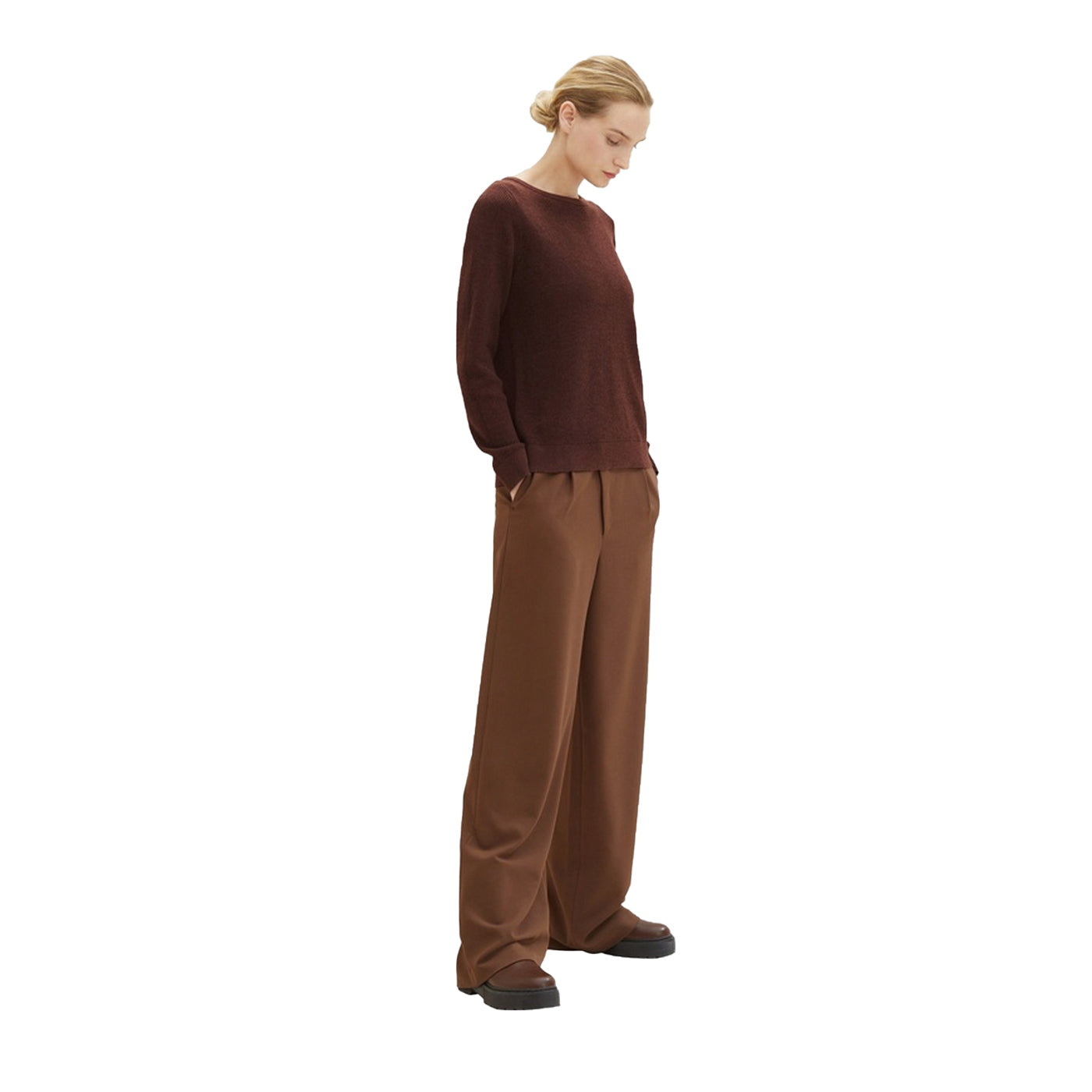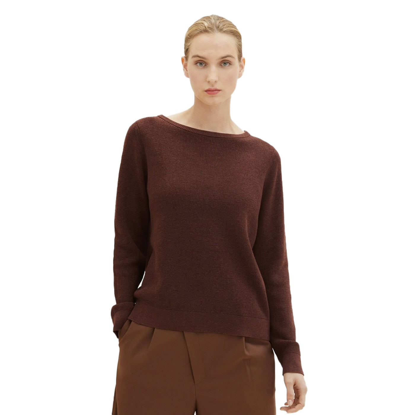 Tom Tailor női pulóver, hosszú ujjú, O-nyakú, rövid szabású, sötétbarna színű.