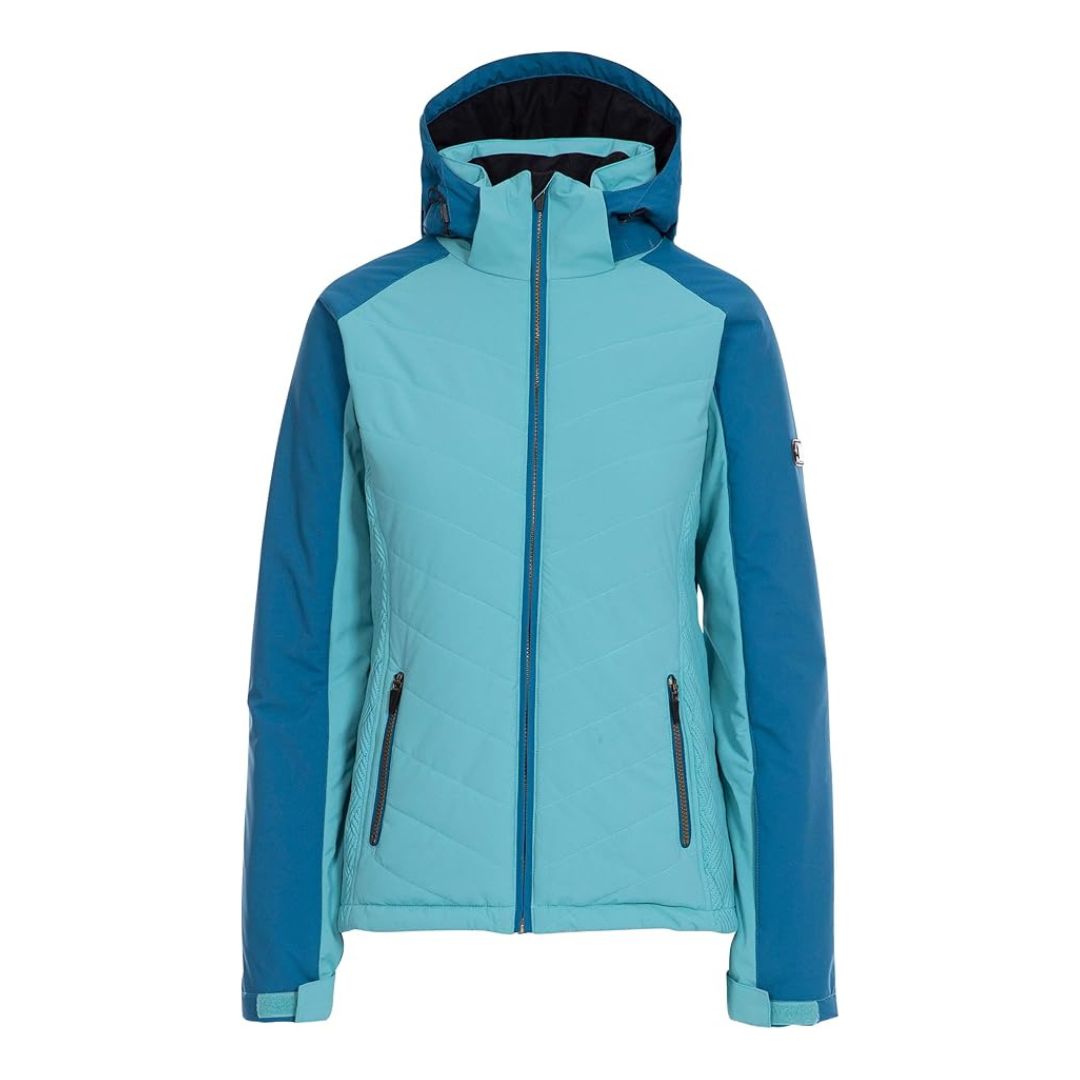 Trespass női sídzseki, kék ,2 cipzáras kézmelegítő zseb, levehető, cipzáras kapucni, enyhén bélelt, levehető cipzáras hófogó szoknya, oldalpaneles és ujjrészeknél gumírozott (smock) kialakítás.