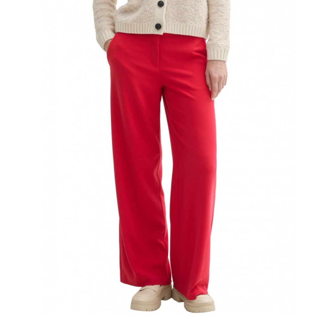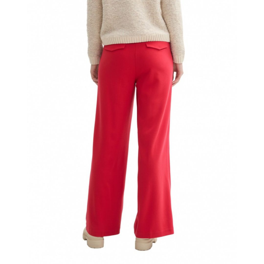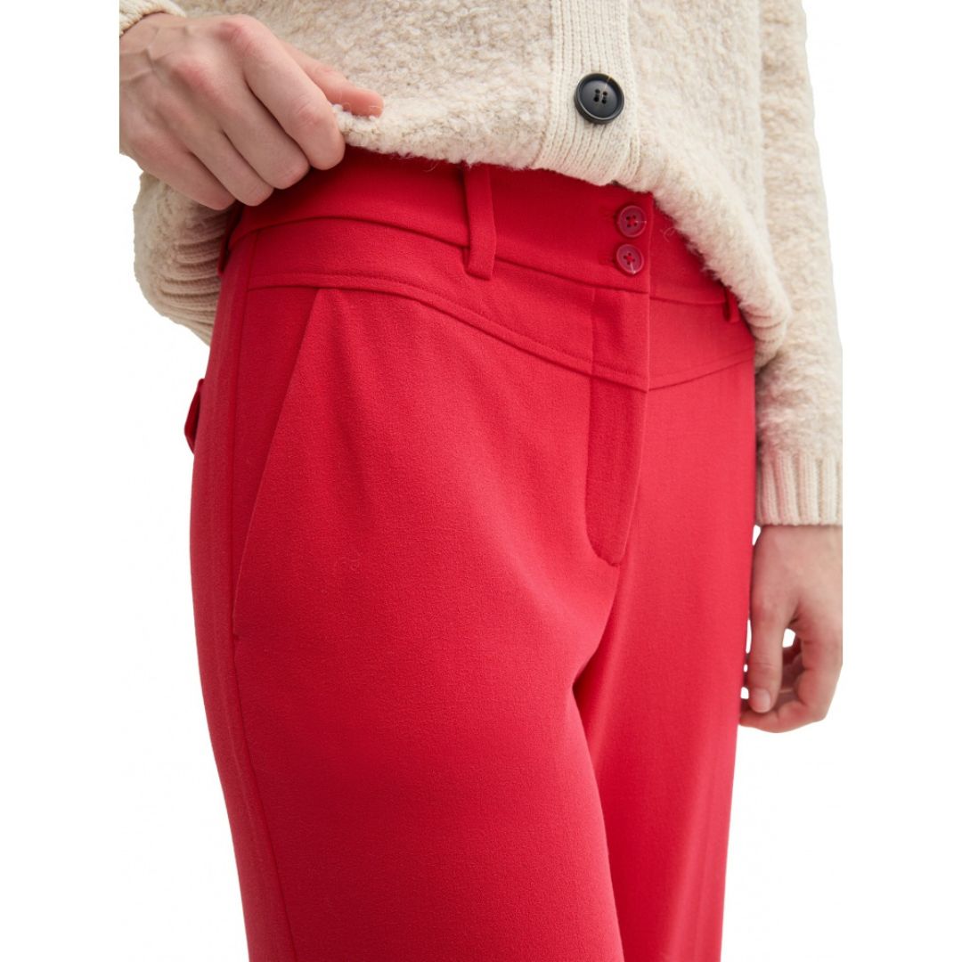Tom Tailor női nadrág, egyenes szabású, gumírozott derékkal, cipzáras zsebekkel, piros színben.