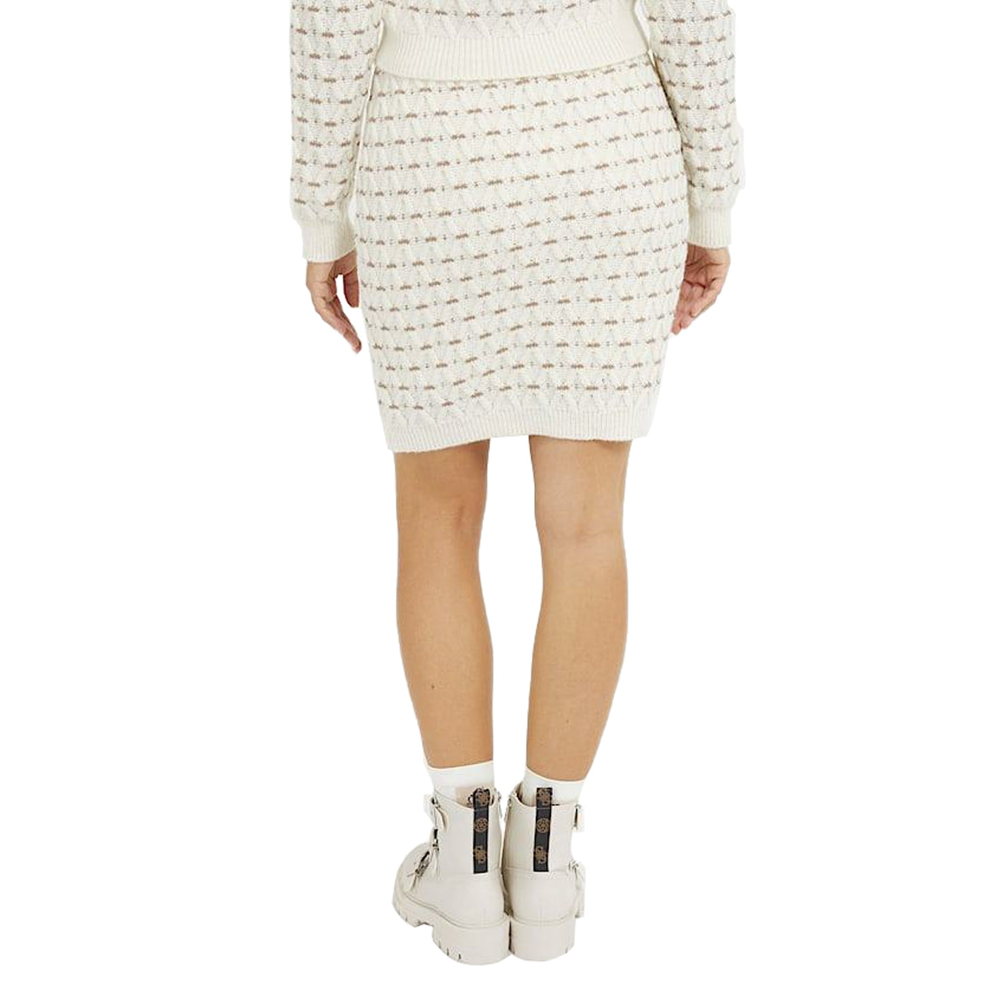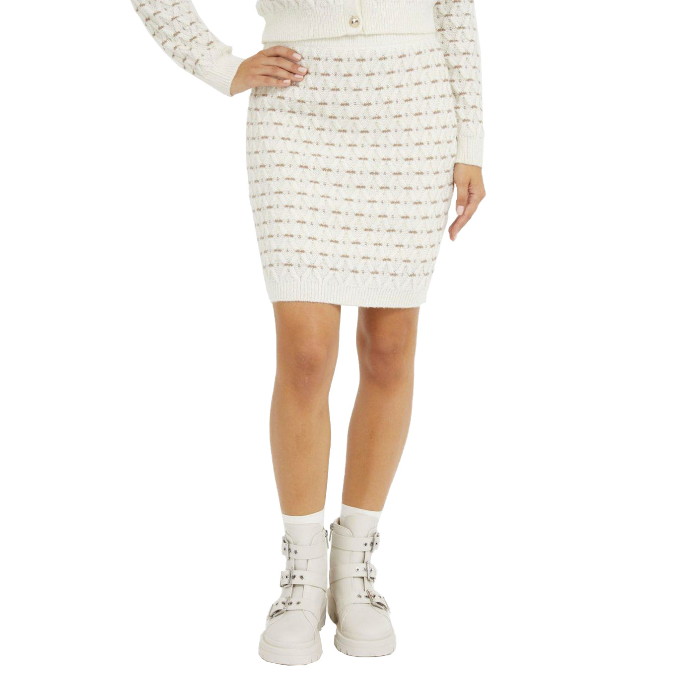 Guess Női szoknya, magas derekú, krémszínű, barna mintás, rövid fazonú, gyapjúkeverék.