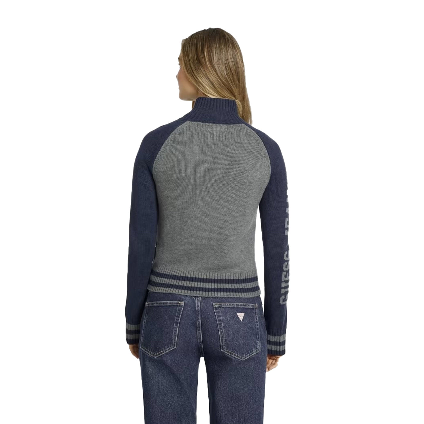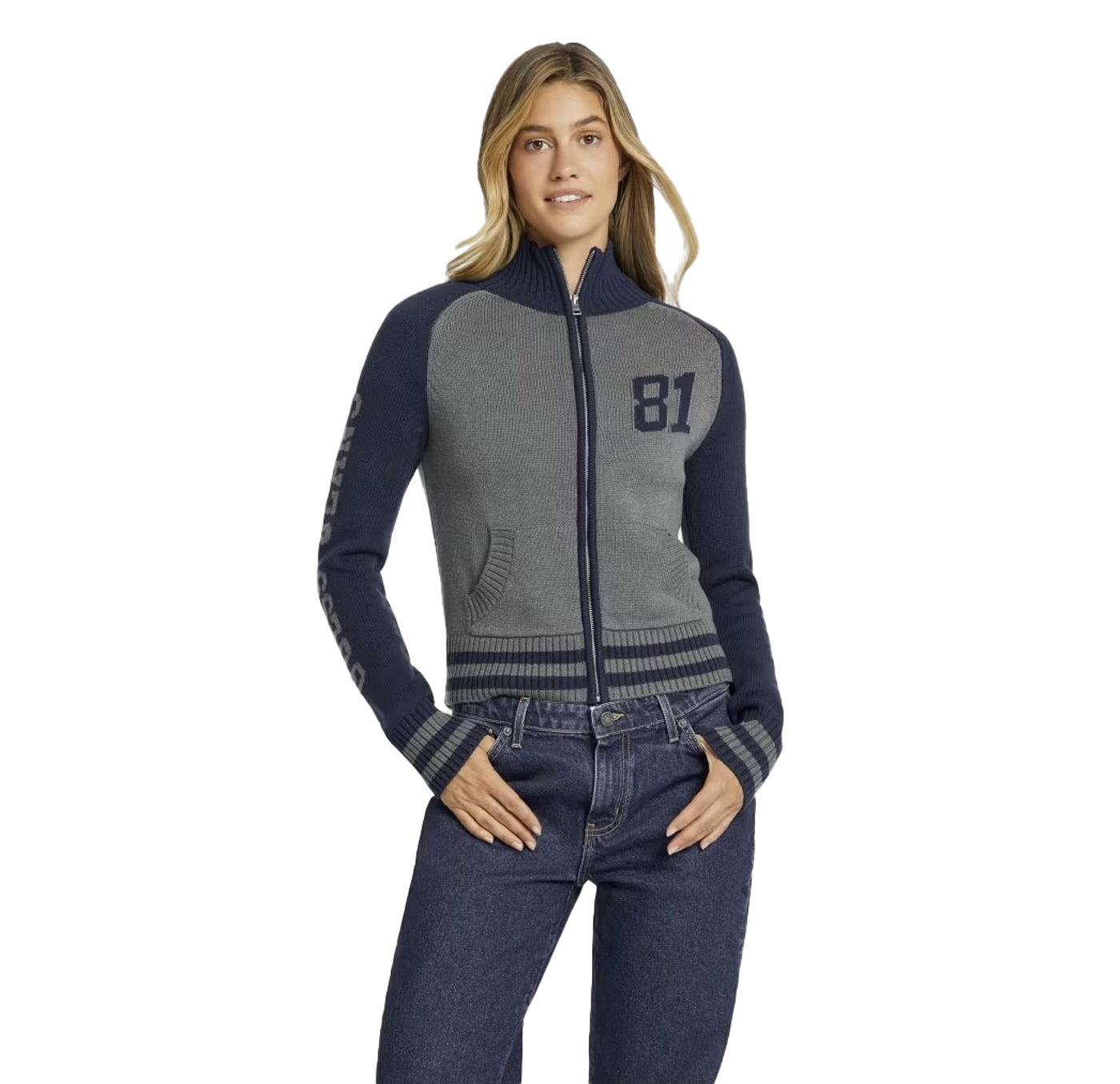 Guess női kardigán, szürke színű, sötétkék hosszú ujjú, rövid fazon, kapucni nélkül, zsebekkel, márkajelzéssel, cipzárral záródik.