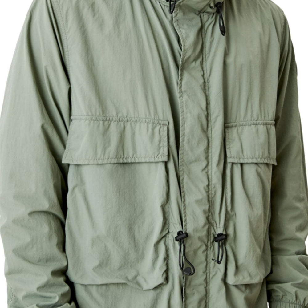s.Oliver Férfi széldzseki, hosszú ujjú, kerek nyakú, cipzáras, zsebes, patentos, húzózsínóros, kapucnis, midi fazonú, rozmaring zöld színű.